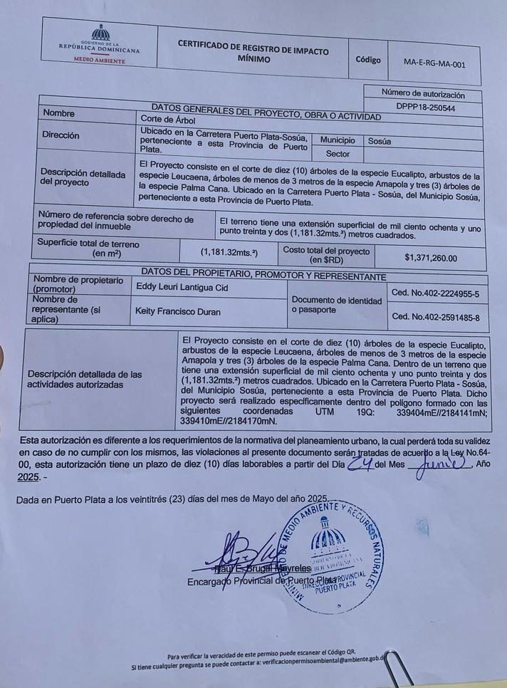 Posteriormente, según documentos mostrados, la compañía obtuvo un permiso de Medio Ambiente Puerto Plata fechado el 23 de mayo de 2025, limitado al corte de 10 árboles de eucalipto y otros de menor tamaño.