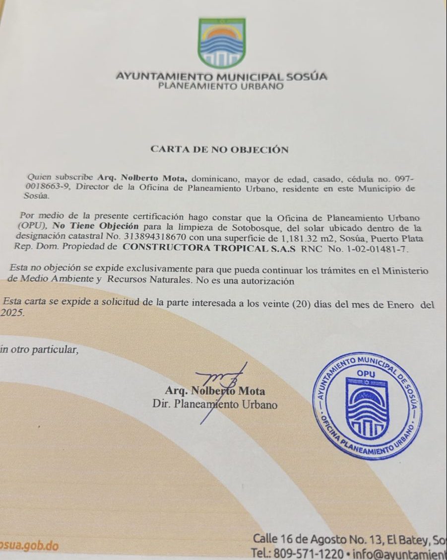 Los denunciantes explicaron que la empresa Constructora Tropical, S.A. contaba con una carta de “No Gestión” del Ayuntamiento de Sosúa, emitida el pasado 20 de enero, que no otorgaba permiso de tala, sino que indicaba que debían gestionar la autorización ante el Departamento de Medio Ambiente.