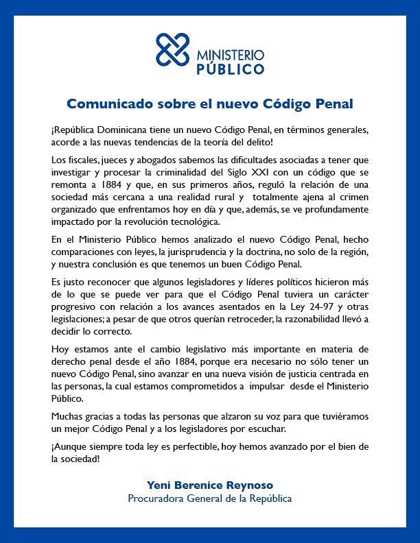 “¡República Dominicana tiene un nuevo Código Penal, en términos generales, acorde a las nuevas tendencias de la teoría del delito!”, destacó en un comunicado la procuradora general de la República, Yeni Berenice Reynoso, al referirse a la nueva ley que supera un texto de más de 140 años.