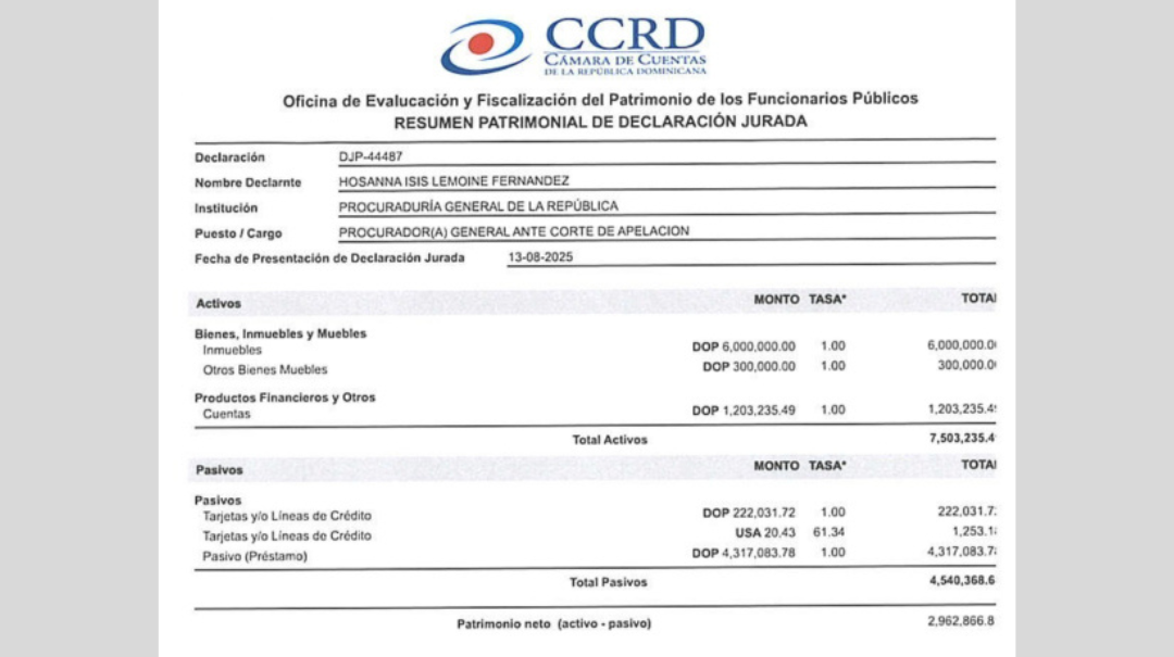 Luego de la polémica generada por la publicación de su declaración jurada, la procuradora de la Corte de Apelación de Montecristi, Hosanna Isis Lemoine Fernández, informó que la cifra millonaria atribuida a su patrimonio se debió a un error involuntario de registro.