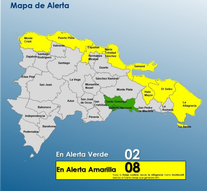 En virtud de la Ley 147-02 sobre Gestión de Riesgos, el COE mantiene alerta amarilla para toda la franja costera desde La Altagracia hasta Montecristi por el fuerte oleaje, mar de fondo, olas rompientes y corrientes de resaca, así como alertas verdes y amarillas por posibles crecidas de ríos, arroyos y cañadas e inundaciones repentinas o urbanas en varias provincias y el Distrito Nacional. A