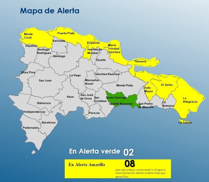 El Centro de Operaciones de Emergencias (COE), informó este lunes que mantiene 10 provincias en alertas, ocho de ellas en amarilla y dos en verde, ante los efectos indirectos del huracán, categoría 4, Erín.