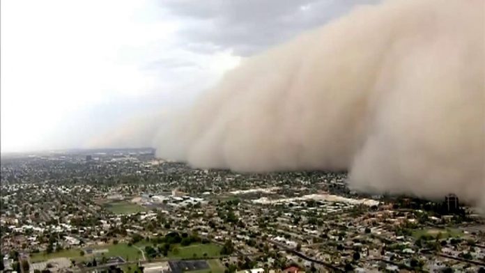 Los servicios meteorológicos advirtieron sobre rachas de viento de entre 30 y 40 millas por hora (48 a 65 kilómetros por hora), mientras la pared de arena alcanzaba una altura de más de 900 metros.