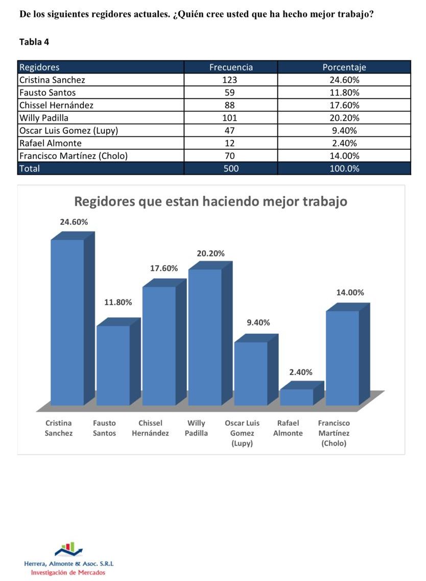 Con estos resultados, la regidora Cristina Sánchez se coloca como la mejor valorada entre sus pares, seguida de Willy Padilla y Chissel Hernández.