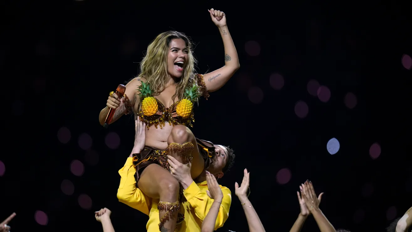 El medio tiempo comenzó con Karol G apareciendo dentro de una especie de flor gigante y lució un diminuto conjunto que consistía en un brasier color café decorado con dos piñas en la parte delantera y una falda corta.