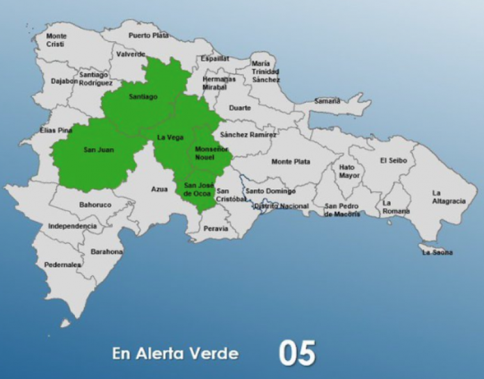 El organismo dispuso la alerta verde para las provincias San Juan, Santiago, La Vega, Monseñor Nouel y San José de Ocoa, ya que se prevé que en horas de la tarde ocurran aguaceros moderados a fuertes con tormentas eléctricas y ráfagas de viento.