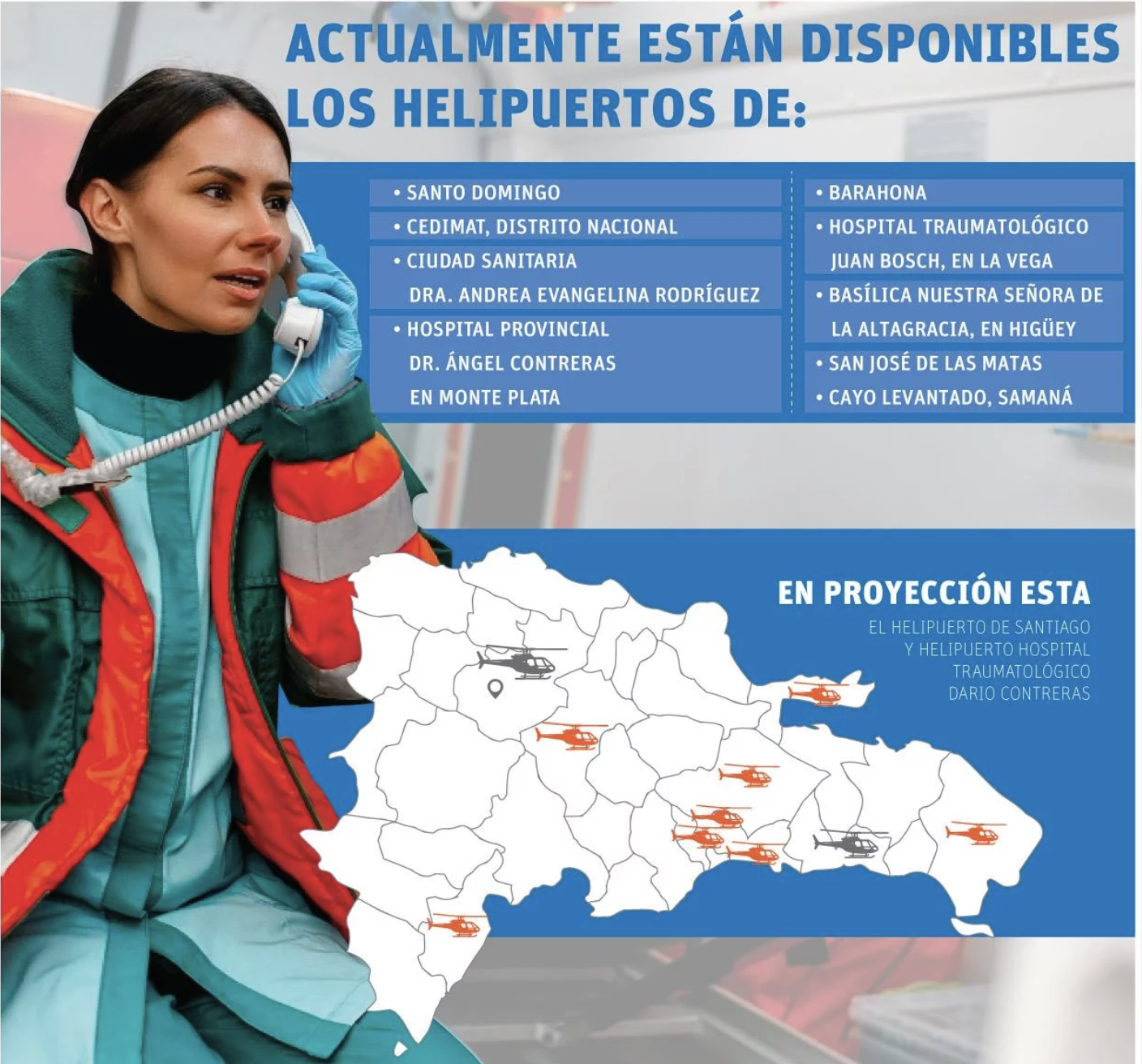 Actualmente, la República Dominicana cuenta con helipuertos operativos en las siguientes localidades: Santo Domingo (Distrito Nacional): Cedimat y Ciudad Sanitaria Dra. Evangelina Rodríguez. Monte Plata: Hospital Provincial Dr. Ángel Contreras.