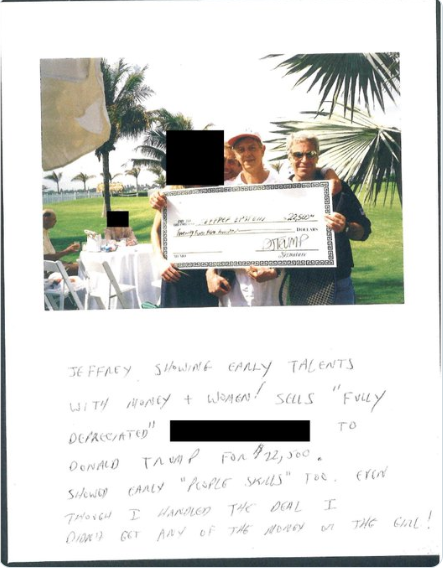 La página incluye una fotografía de Epstein junto a Joel Pashcow, miembro veterano de Mar-a-Lago, sosteniendo un cheque gigante, acompañada de un texto manuscrito que dice: “Jeffrey mostrando talentos tempranos con dinero y mujeres.