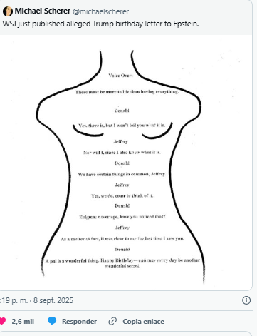 Esta no es la única página problemática del “libro de cumpleaños” revelada. Los demócratas también publicaron lo que parece ser un mensaje de cumpleaños de Trump a Epstein, escrito dentro de un dibujo tosco del contorno del cuerpo de una mujer. Trump negó haber escrito esa nota.