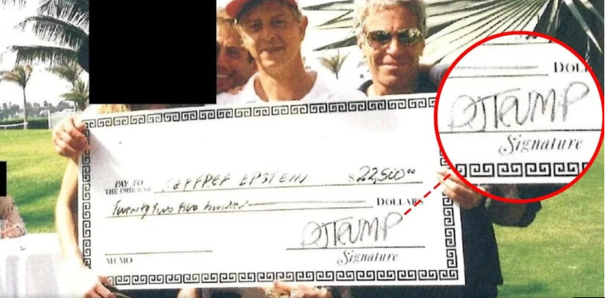 La imagen muestra dos rostros censurados, así como el nombre de la mujer en el cheque, el documento incluye una firma “DJ Trump”, aunque no se asemeja a la caligrafía del presidente en otros papeles oficiales.