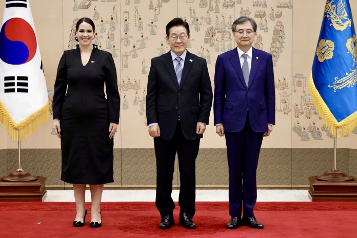 Seúl, República de Corea.– La Embajadora de la República Dominicana ante la República de Corea, Angie Shakira Martínez Tejera, presentó sus Cartas Credenciales al Presidente coreano, Su Excelencia Lee Jae-myung, en una ceremonia oficial celebrada en la Oficina Presidencial en Yongsan, Seúl. Con este acto, quedó formalmente acreditada como Embajadora Extraordinaria y Plenipotenciaria ante ese país asiático.