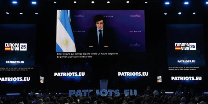 Milei participó por videoconferencia en el gran acto político de cierre de la cumbre 'Europa Viva 25′, celebrada por el partido ultraderechista español Vox este fin de semana.