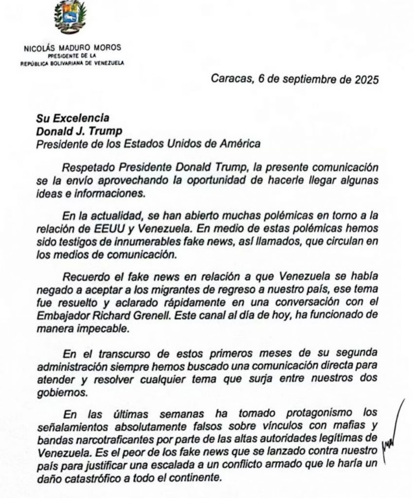 La misiva fue “entregada” a un “intermediario suramericano”, según la vicepresidenta Delcy Rodríguez, el 6 de septiembre, cuatro días después del primer ataque de Estados Unidos contra una embarcación que presuntamente había salido de Venezuela con drogas, dejando un saldo de 11 fallecidos.