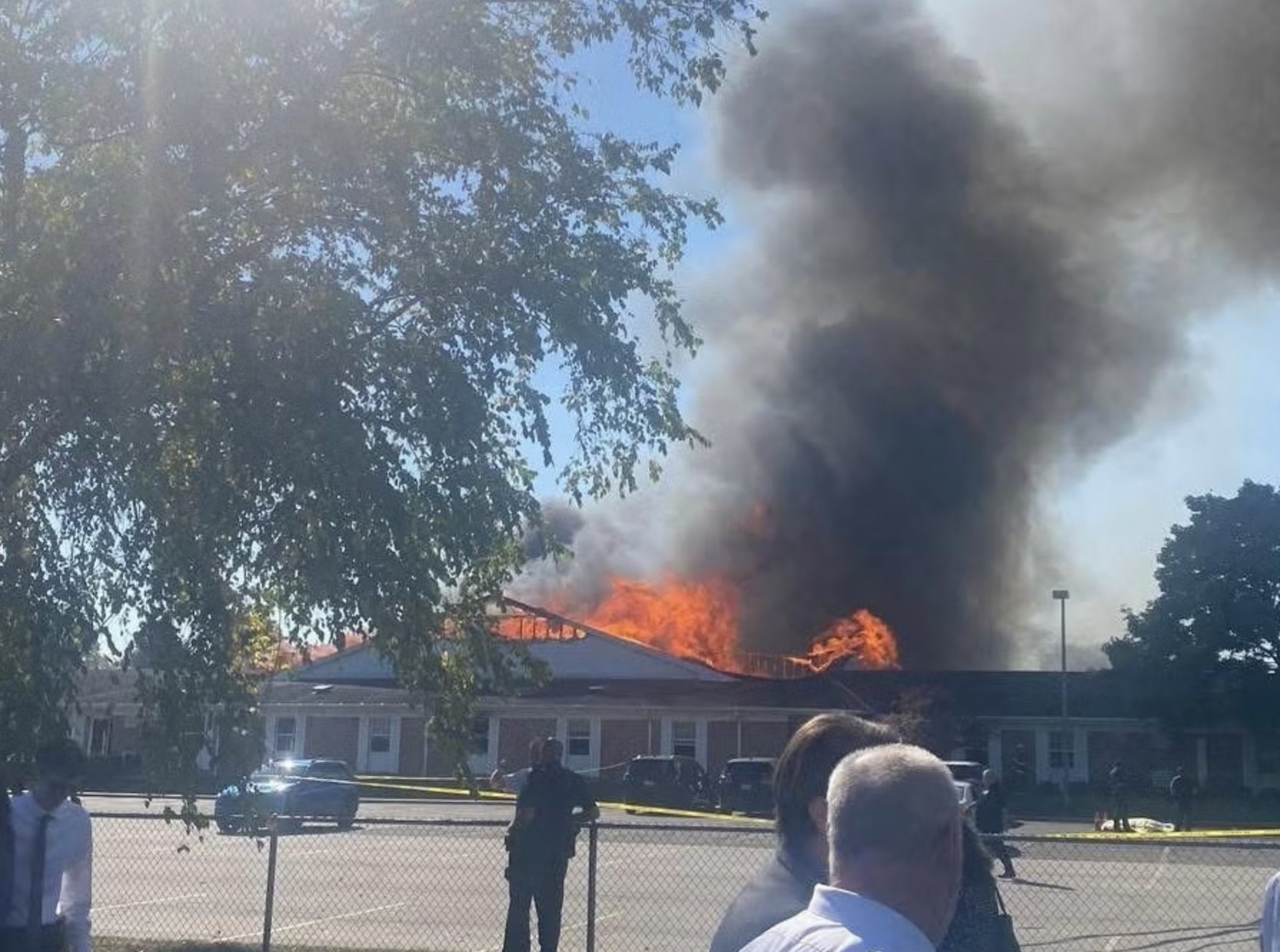 Varios videos difundidos en redes sociales muestran una densa cortina de humo saliendo del edificio, evidencia del incendio que acompaña al tiroteo.