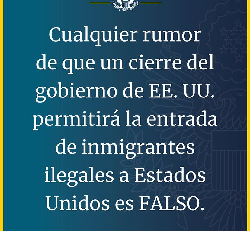 En un comunicado difundido a través de sus cuentas oficiales, la misión diplomática calificó como “falso” el contenido que aseguraba que un cierre presupuestario en el Congreso permitiría el ingreso libre de inmigrantes indocumentados a territorio estadounidense.