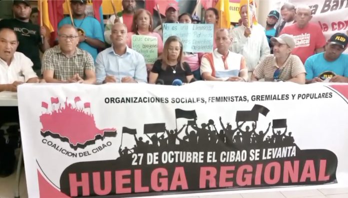 SANTIAGO, REP. DOMINICANA.– Una amplia coalición de organizaciones sociales, feministas, gremiales y populares del Cibao anunció hoy en conferencia de prensa la convocatoria a una huelga regional que paralizará las 14 provincias de la región el próximo lunes 27 de octubre. La medida busca exigir al gobierno respuestas concretas ante el alto costo de la vida, la corrupción, la impunidad y una serie de demandas comunitarias desatendidas.