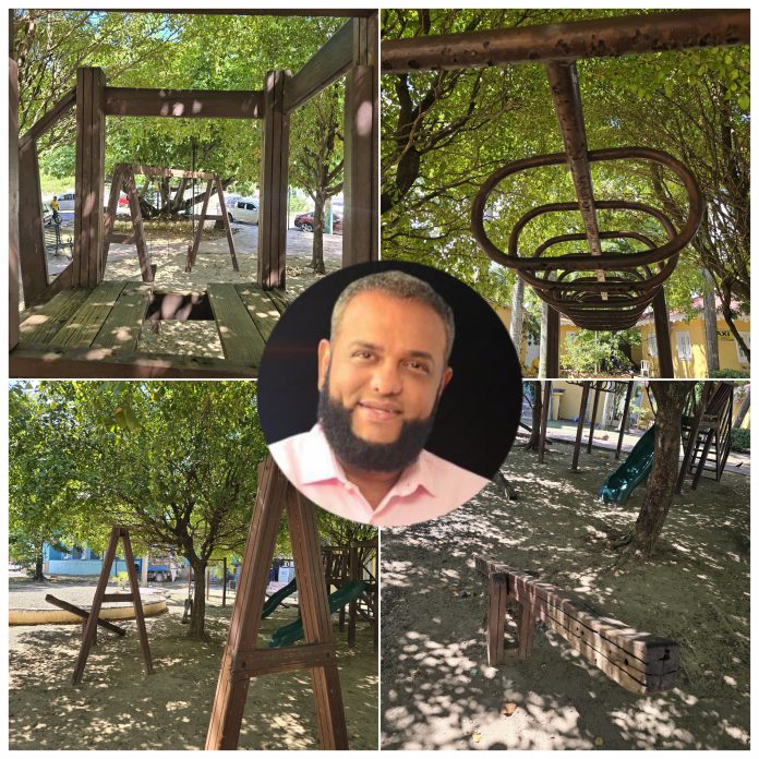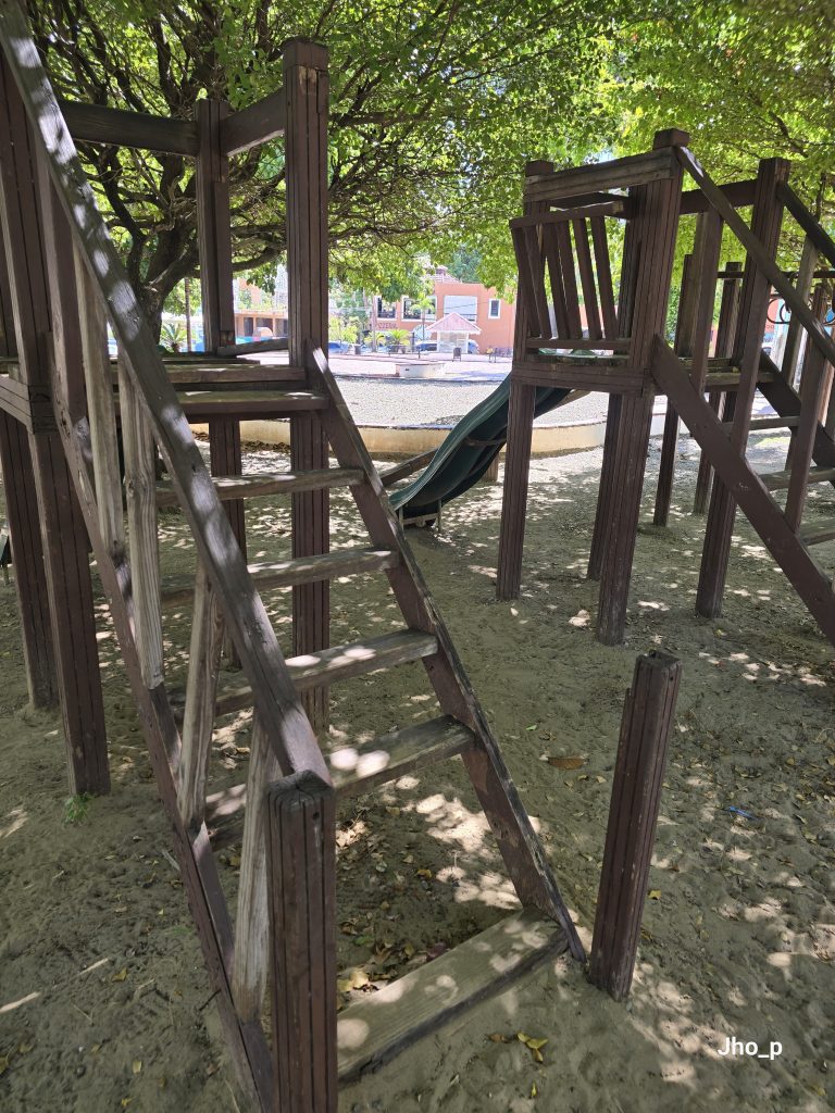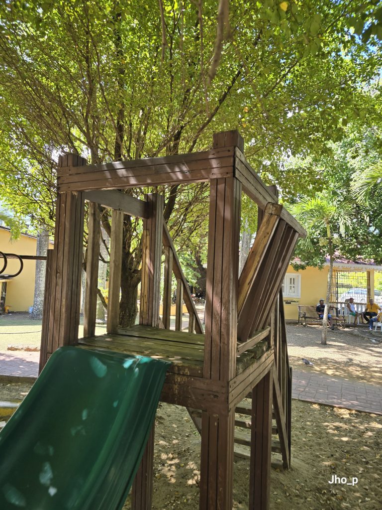 Lo que alguna vez fue un punto de encuentro para familias, niños y visitantes —y escenario del tradicional Festival Multicultural de Sosúa— hoy luce completamente deteriorado: estructuras de madera podridas, columpios desaparecidos, cercas oxidadas y un entorno cubierto de basura, arena sucia y hojas secas.
