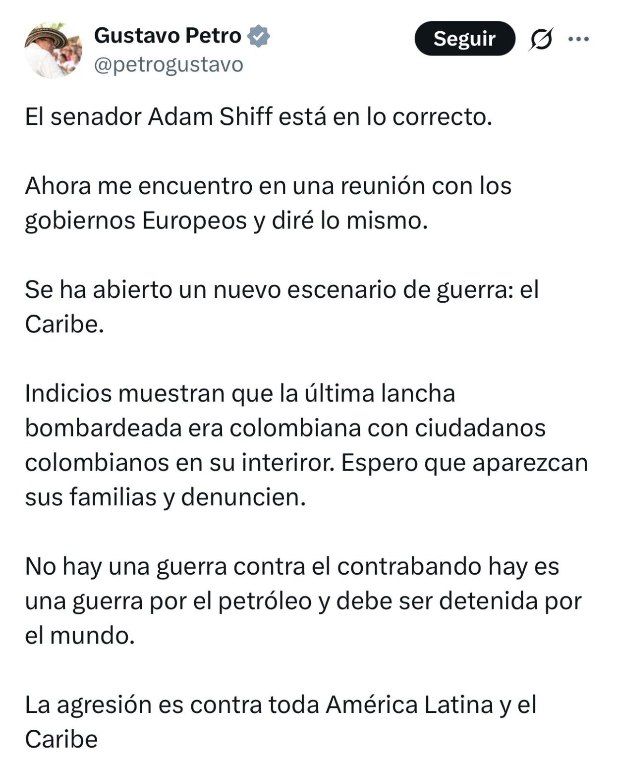 “Se ha abierto un nuevo escenario de guerra: el Caribe. Indicios muestran que la última lancha bombardeada era colombiana con ciudadanos colombianos en su interior”, escribió Petro en la red social X. El mandatario no presentó pruebas ni precisó el número de ocupantes, aunque pidió que “sus familias aparezcan y denuncien”.