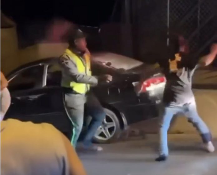 Video que circula en redes sociales evidencia el momento exacto en el que un hombre cuya identidad se desconoce le hace frente a agentes policiales y lanza piedras sin control contra la parte trasera de un vehículo estacionado, de color negro.