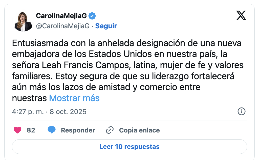 “Entusiasmada con la anhelada designación de una nueva embajadora de los Estados Unidos en nuestro país, la señora Leah Francis Campos, latina, mujer de fe y valores familiares. Estoy segura de que su liderazgo fortalecerá aún más los lazos de amistad y comercio entre nuestras naciones. ¡La esperamos, señora embajadora!”, expresó Mejía a través de una publicación en su cuenta de X (antiguo Twitter).