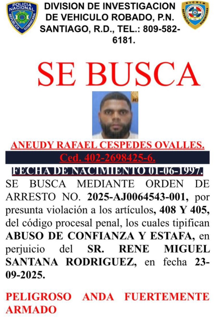 La Policía Nacional identificó a Aneudy Rafael Céspedes Ovalles, de 28 años, como presunto autor de múltiples hechos delictivos relacionados con la sustracción de vehículos mediante abuso de confianza y estafas, logrando además la recuperación de 13 automóviles sustraídos.