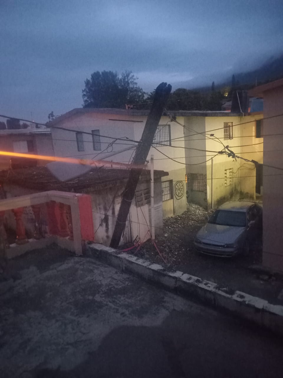 Puerto Plata. – En el sector Playa Oeste, área conocida como Los Edificios y próximo al barrio Barrio Haití, se encuentra un poste del tendido eléctrico de EDENORTE prácticamente sosteniéndose solo por los cables, tras los aguaceros del pasado domingo.