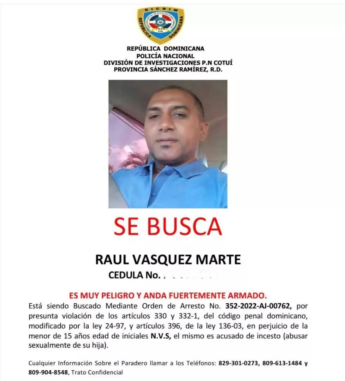 Barahona.– La Policía Nacional informó la detención de Raúl Vásquez Marte, quien permanecía prófugo desde el año 2022, acusado de presunta agresión física contra dos de sus hijas menores de edad.