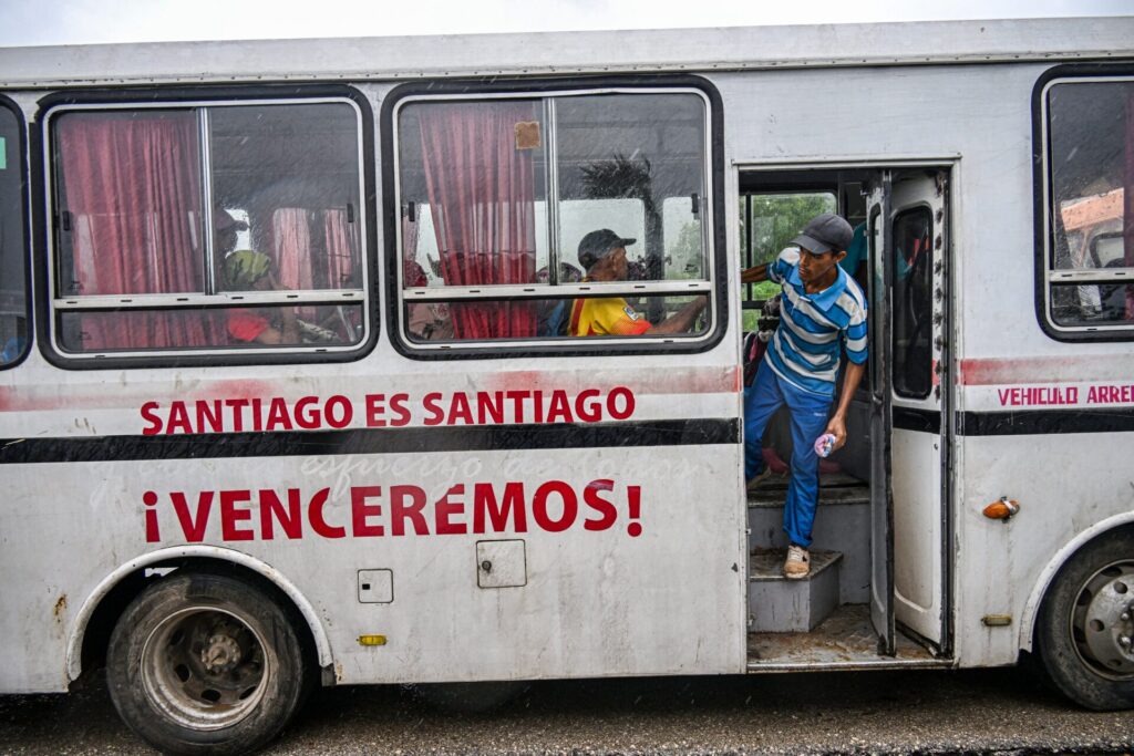Dentro de la guagua, se observan ciudadanos cubanos con maletas y bultos en mano, trasladándose hacia lugares seguros para resguardarse y evitar enfrentar directamente los efectos del huracán Melissa.