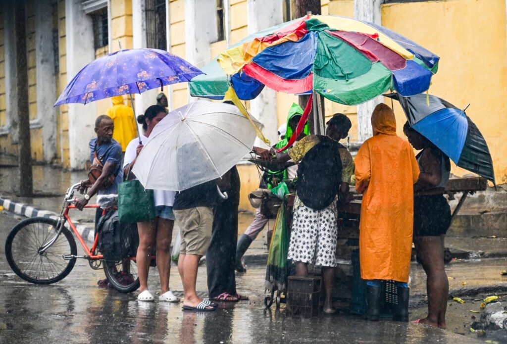En la fotografía se observa a ciudadanos cubanos con sombrillas, evidenciando que las lluvias de Melissa ya se sienten en la isla, mientras otros vecinos cargan láminas de zinc en las manos para proteger sus viviendas, mostrando la preparación y precaución ante el huracán.En la imagen también se aprecia a una ciudadana cubana con una lámina de zinc en mano, intentando ingresar a su vivienda para protegerla de las intensas lluvias provocadas por el huracán Melissa.A pesar de las intensas lluvias provocadas por el huracán Melissa, la fotografía muestra a ciudadanos cubanos con paraguas en mano comprando alimentos de un carrito ubicado en medio de la calle, reflejando la resiliencia y adaptación de la población ante la emergencia.La imagen también muestra un vehículo intentando cruzar un charco de agua, mientras al fondo se observan viviendas deterioradas, evidenciando el impacto que las lluvias de Melissa ya están causando en la infraestructura local.En la fotografía se aprecia a un guardia cubano ayudando a una anciana a resguardarse de las lluvias provocadas por el huracán Melissa, un gesto que resalta por su solidaridad y carácter heroico ante la emergencia.