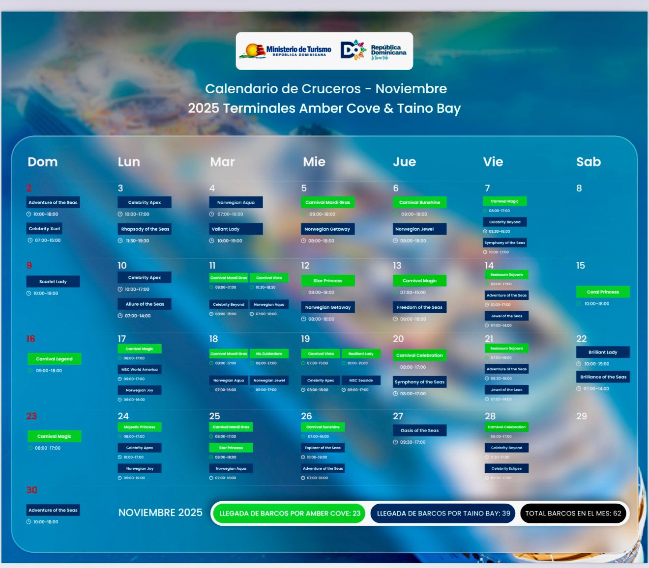 “El mes de noviembre marcará uno de los períodos de mayor movimiento en los puertos turísticos del país. Estos 62 cruceros reflejan la confianza de las principales líneas internacionales en Puerto Plata y en la gestión que encabeza el ministro David Collado para continuar fortaleciendo el turismo dominicano”, expresó Paulino.