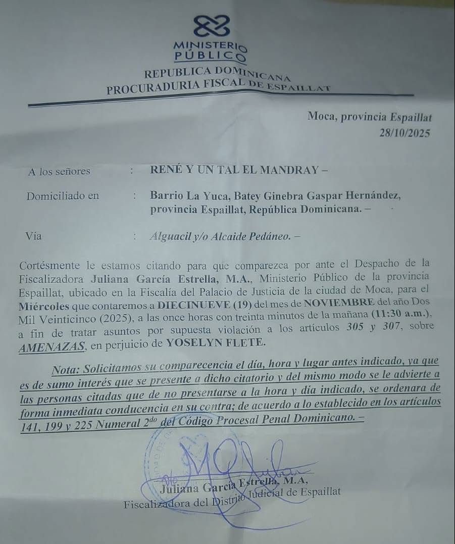 Ante la situación, la mujer acudió a la Procuraduría Fiscal de Espaillat, donde presentó formal denuncia. Las autoridades fijaron una cita para el miércoles 19 de noviembre de 2025, con el objetivo de dar seguimiento al caso.