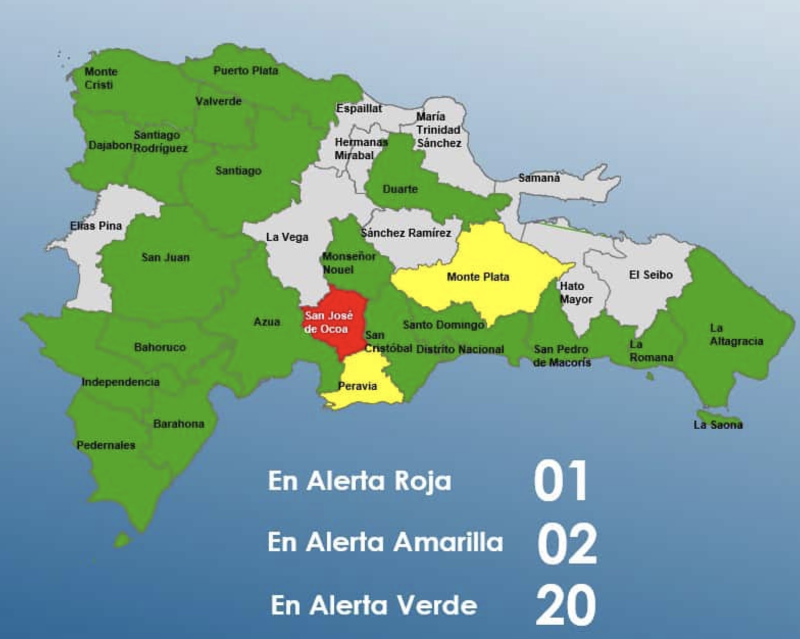 En alerta verde están el Distrito Nacional y las provincias Monseñor Nouel, Independencia, Puerto Plata, San Cristóbal, Azua, La Altagracia Santiago Rodríguez, Duarte, Bahoruco, Santiago, Barahona, La Romana, Dajabón, Valverde, Santo Domingo, San Juan, Pedernales, San Pedro de Macorís y Montecristi.