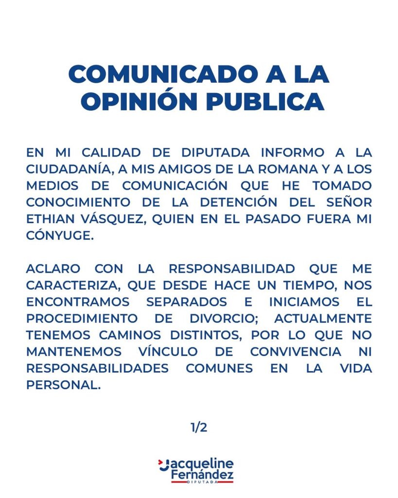 La diputada del Partido Revolucionario Moderno (PRM) por La Romana, Jacqueline Fernández, informó que tiene conocimiento de la detención de su exesposo, Ethian Vásquez, quien fue arrestado por la Dirección Nacional de Control de Drogas (DNCD) con fines de extradición hacia Estados Unidos por alegados vínculos con el narcotráfico.