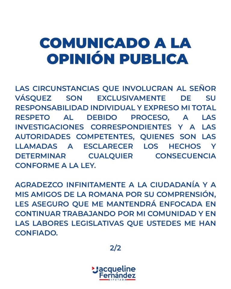 “Las circunstancias que involucran al señor Vásquez son exclusivamente de su responsabilidad individual”, indicó la legisladora, al tiempo que expresó su respeto al debido proceso y a las autoridades competentes.