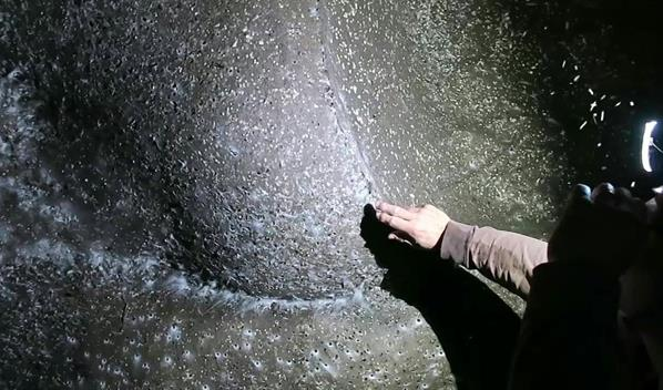 Imágenes recibidas el miércoles por la AFP muestran partes de la inmensa red colgando de la pared como una pesada cortina de terciopelo negro bajo la mirada de fascinación de un científico equipado como un espeleólogo.