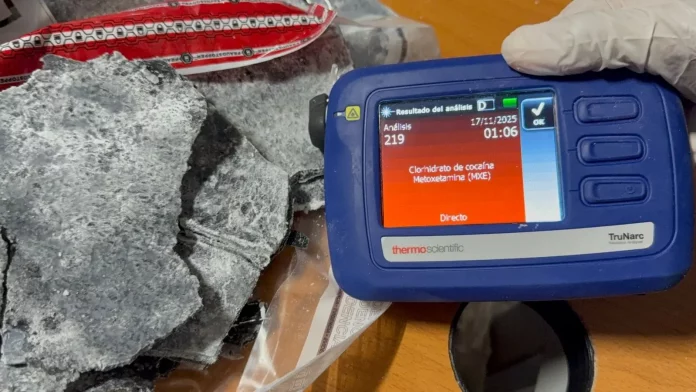 Por instrucciones del fiscal, se inició el protocolo de inspección, descubriendo en ambos equipajes un doble fondo, donde se confiscaron los cuatro paquetes de la presunta droga, envueltos en fundas de color negro con un material engomado.