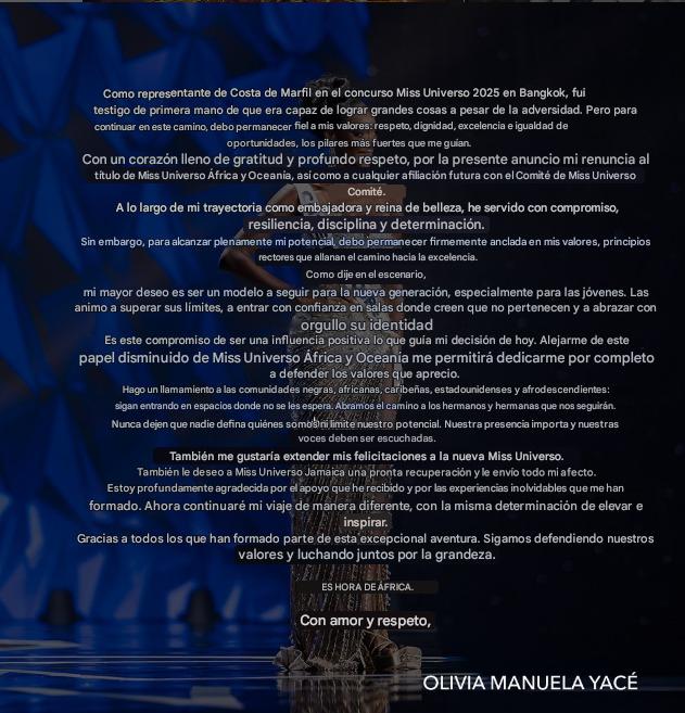 Olivia Yace la representante de Costa de Marfil en Miss Universo 2025 este lunes su renuncia formal al título de Miss Universo África y Oceanía, así como su desvinculación total de cualquier futura afiliación con el certamen.