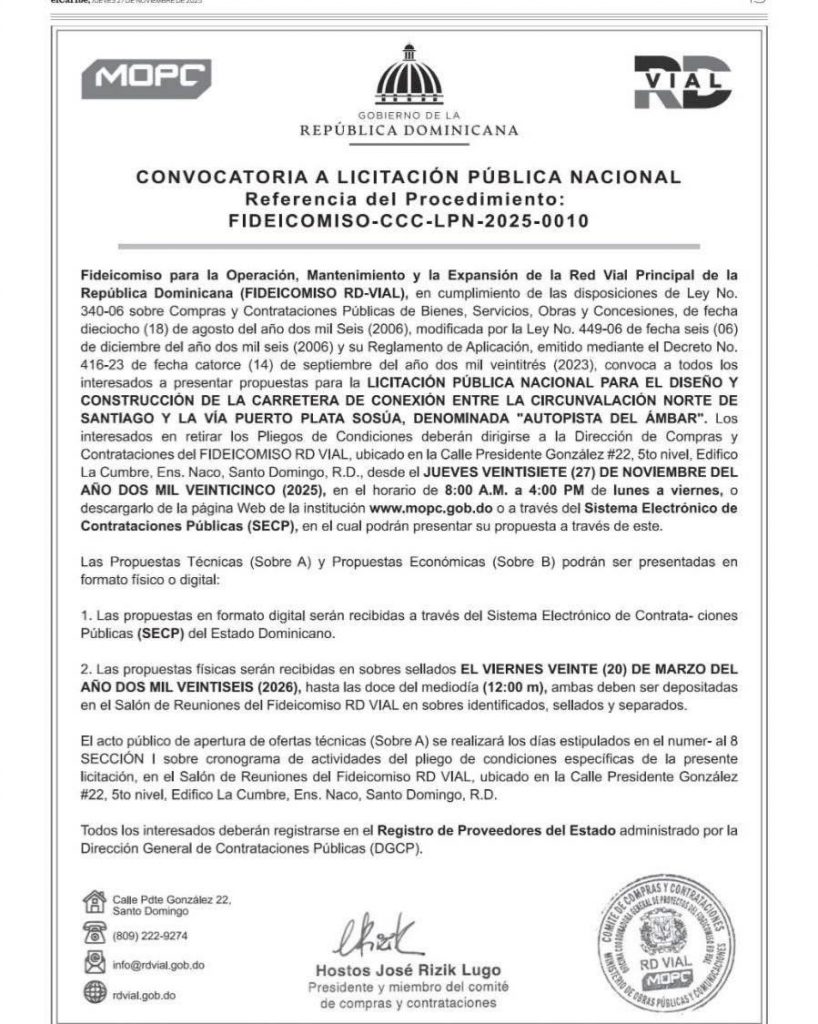 El ministro Administrativo de la Presidencia, José Ignacio Paliza, anunció la apertura oficial del proceso de licitación pública nacional para la construcción de la Carretera del Ámbar, una de las obras viales más estratégicas y esperadas en la República Dominicana.