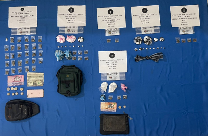 Como resultado de 274 allanamientos y múltiples operativos contra el microtráfico, los agentes y fiscales, incautaron además, 27 armas de fuego, 73 machetes y cuchillos, 14 vehículos, 112 motocicletas, 118 radios de comunicación, 1,052 celulares, 434 balanzas, 02 chalecos antibalas, 03 máquinas tragamonedas y dinero en pesos y dólares.
