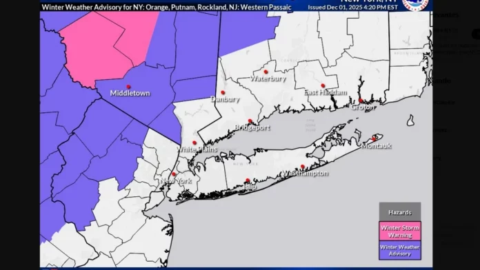 El condado Orange podría recibir de 4 a 7 pulgadas (10 a 18 cm)de nieve, mientras que en partes de Nueva Jersey y Connecticut podrían acumularse de 3 a 5 pulgadas (7 a 12 cm) antes de que se convierta en lluvia, presagió Fox Weather.