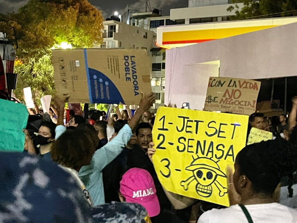 Decenas de personas se congregan en estos momentos frente al Palacio de Justicia, portando carteles con mensajes que denuncian al desfalco millonario en el Seguro Nacional de Salud (SENASA). La protesta ocurre en el marco de la audiencia en la que se conocerá la medida de coerción contra los imputados en el caso, acusados de sustraer de manera ilícita más de 15 mil millones de pesos de la aseguradora estatal.