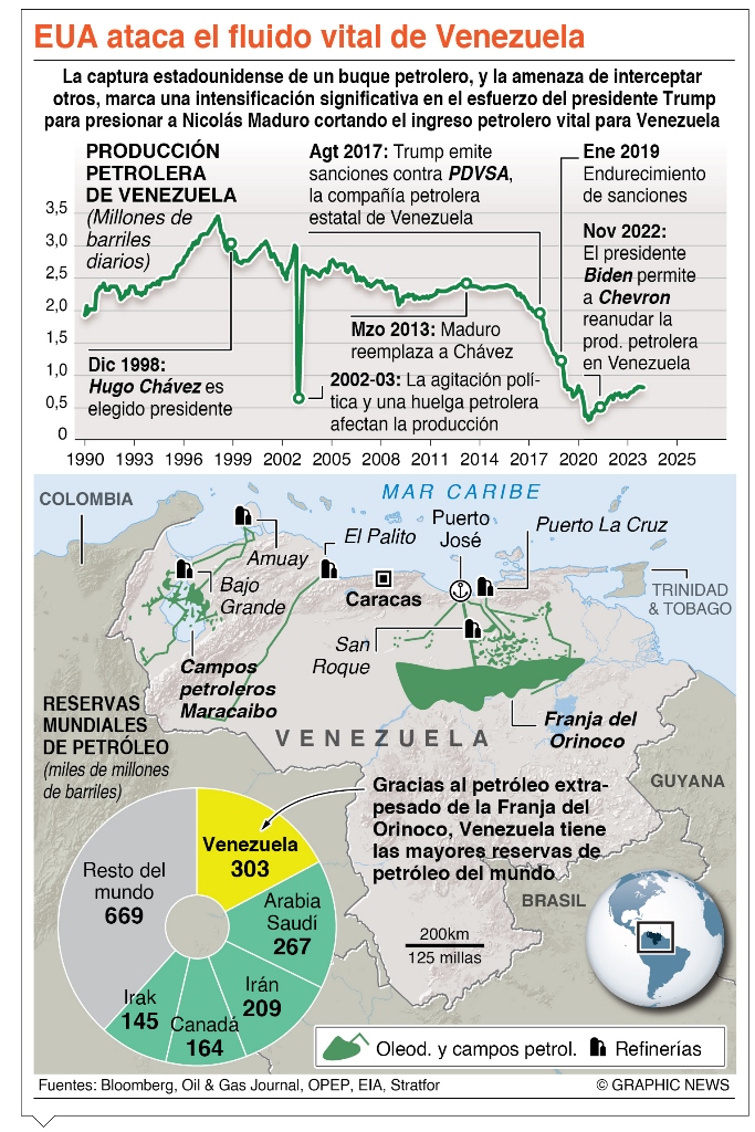 El presidente de Estados Unidos, Donald Trump, anunció el miércoles que su país interceptó y confiscó un petrolero frente a las cosas venezolanas, elevando la tensión entre Washington y Caracas, que se mantiene desde agosto por el despliegue aeronaval estadounidense en el Caribe, visto por Venezuela como una “amenaza”.