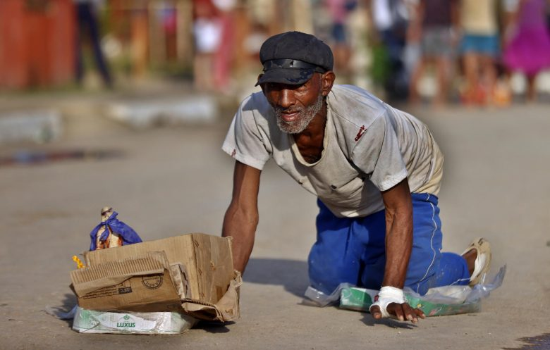 Lázaro, un cubano de 72 años, se arrastra con una perrita de meses a su lado. Primero caminó cientos de kilómetros desde su ciudad, Viñales (Pinar del Río, unos 190 kilómetros al oeste de La Habana), para llegar al santuario de El Rincón, en las afueras de la capital.