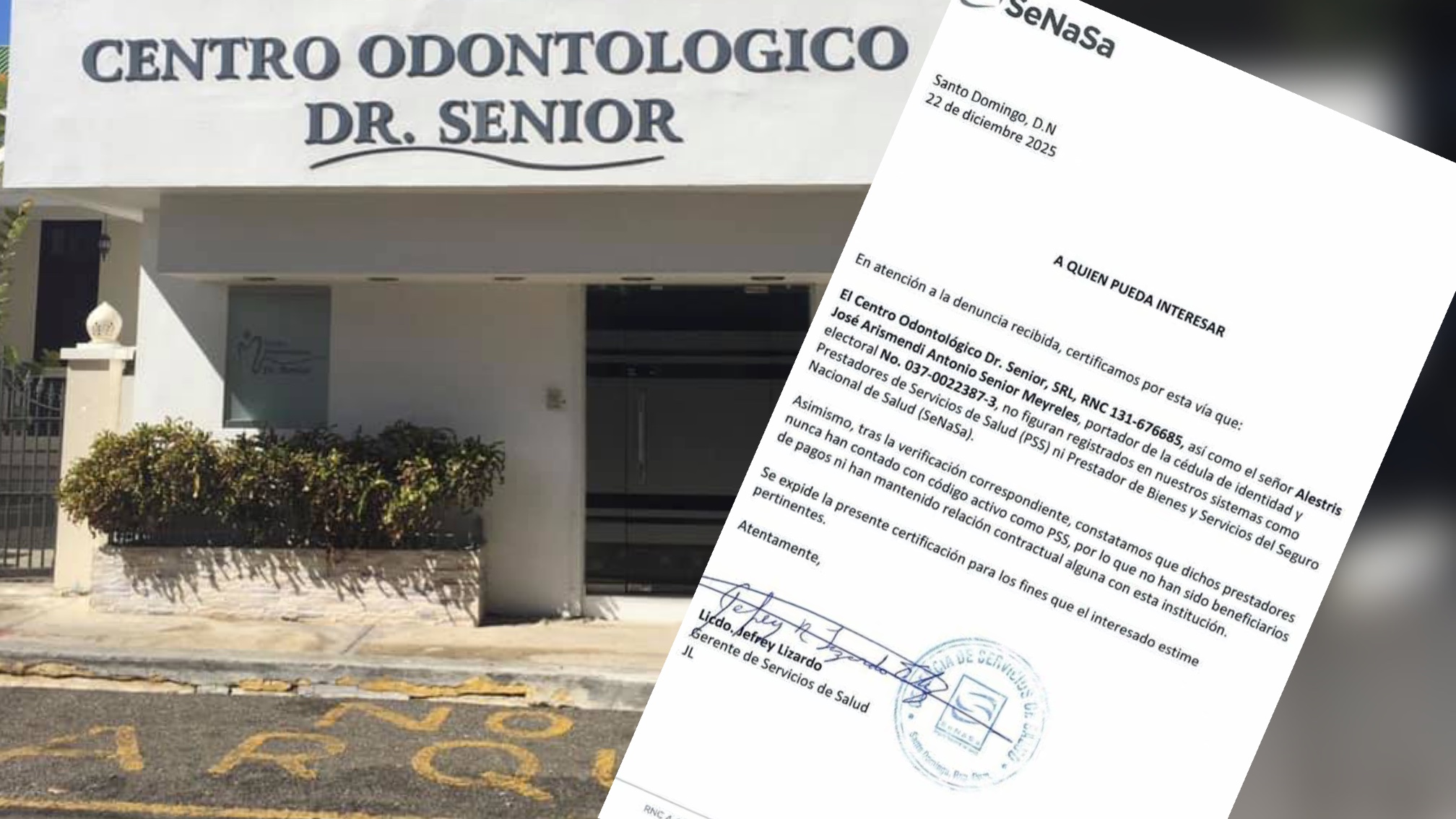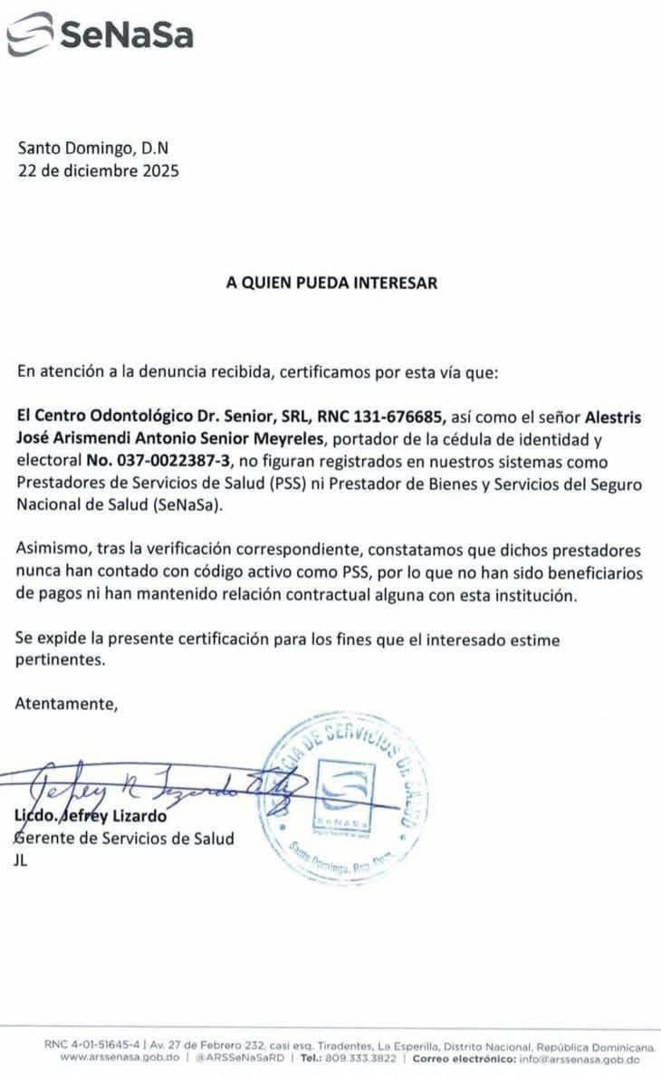PUERTO PLATA.– En medio del debate público generado por el denominado caso SENASA, el Seguro Nacional de Salud (SENASA) emitió una certificación oficial en la que aclara que el Centro Odontológico Doctor Senior, S.R.L., así como su representante, Alestris José Arismendi Antonio Senior Mairellis, no han tenido ningún tipo de relación contractual, comercial ni administrativa con dicha institución.