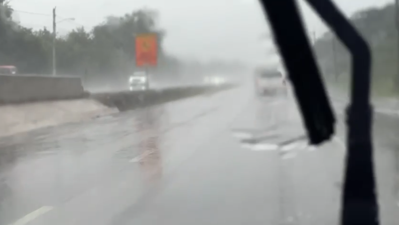 Debido a la intensidad de la lluvia, los conductores se ven obligados a desplazarse a baja velocidad y con extrema precaución, ya que la visibilidad es limitada y el pavimento se encuentra resbaladizo.
