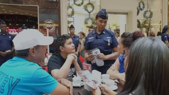 En ese contexto, personal especializado de DEAMVI se desplegó en diversos centros comerciales, donde interactúan de manera directa con ciudadanos y ciudadanas. Llevan mensajes de concienciación enfocados en la prevención de la violencia de género, la protección de la niñez y la promoción de relaciones familiares basadas en el respeto y la tolerancia.