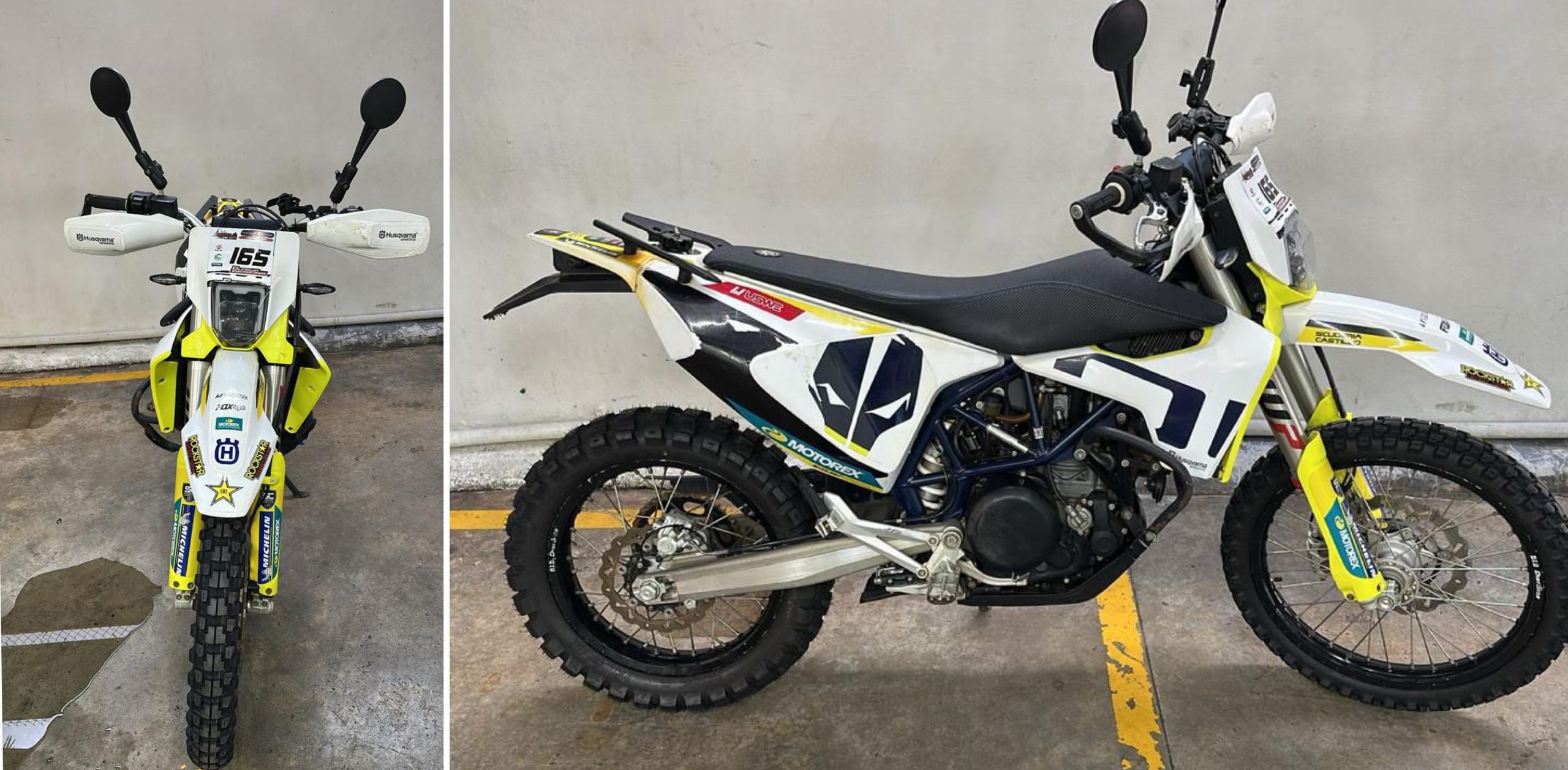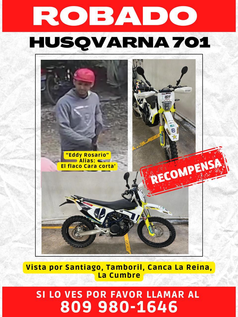 La motocicleta sustraída es una HUSQVARNA modelo 701 Enduro, año 2021, color blanco con azul, placa K2515594.