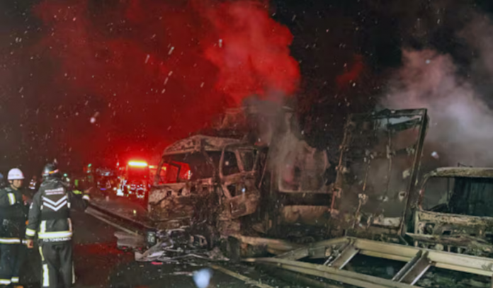 El choque inicial bloqueó varios tramos de la autopista, y los vehículos que circulaban detrás no pudieron frenar debido a la superficie nevada de la vía, lo que desencadenó la reacción en cadena.
