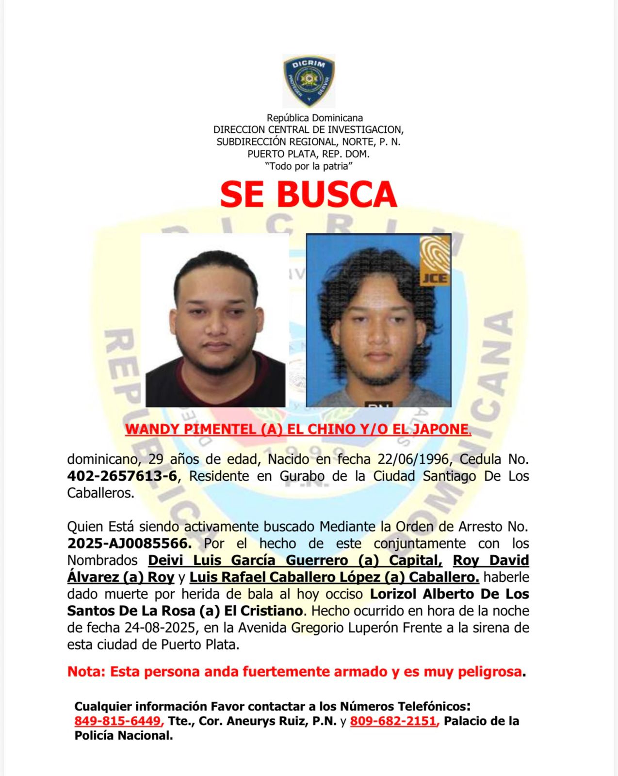 De acuerdo con la nota oficial, el buscado es Wandy Pimentel, alias “El Chino” o “El Japonés”, dominicano, de 29 años, nacido el 22 de junio de 1996, residente en El Gurabo, Santiago de los Caballeros. Contra el mismo pesa la orden de arresto No. 2025-AJ0085-566.