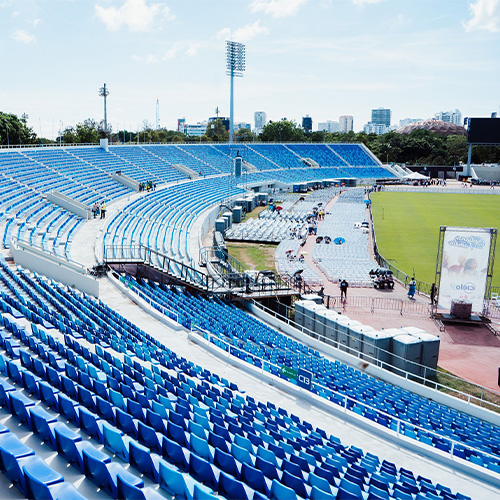 En el lugar se observan equipos organizadores trabajando en el montaje de la tarima, colocación de sillas y acondicionamiento general del área, mientras brigadas realizan labores de limpieza dentro y en los alrededores del complejo deportivo.